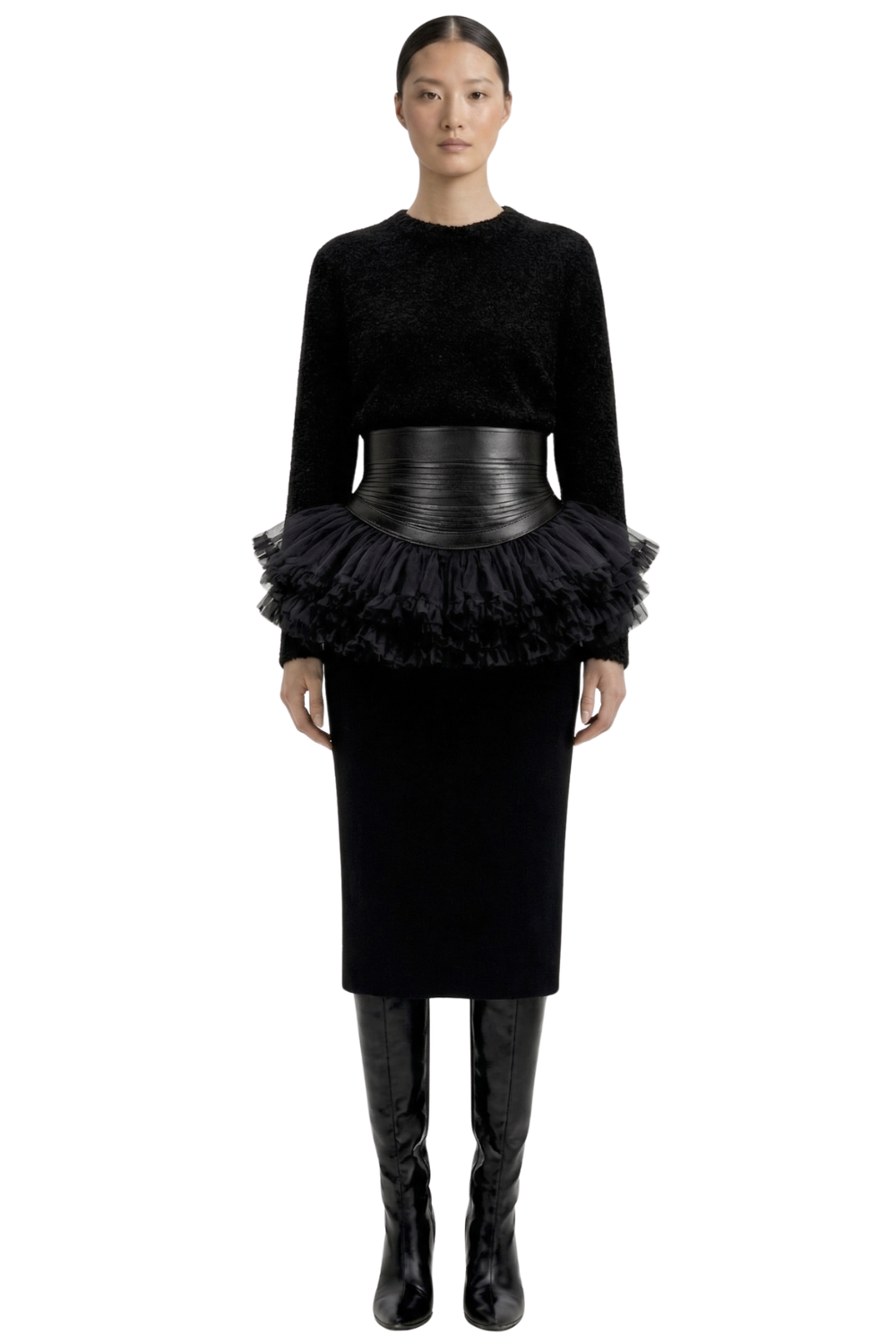 This collection is an exploration of ritual dressing where softness meets severity, ornament meets restraint, and each silhouette carries a sense of ceremony. Lace, leather, embroidery, drape, and texture are used as a language of emotion and structure, creating pieces that feel like relics of the present and objects for the future.